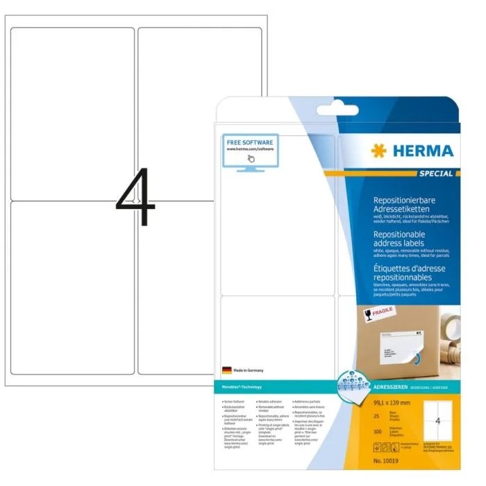 Étiquettes 99,1 x 139 mm repositionnables d'HERMA pour un marquage plus sûre et flexible des produits et documents. N° article 10019