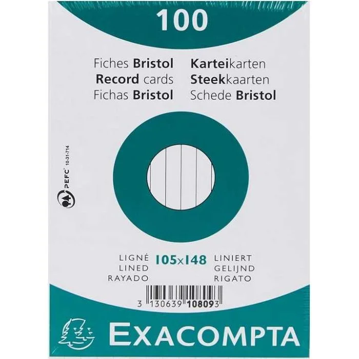 Fiches bristol lignées 105 x 148 mm Blanc Exacompta pour notes et mémos de qualité. N° article 10809SE