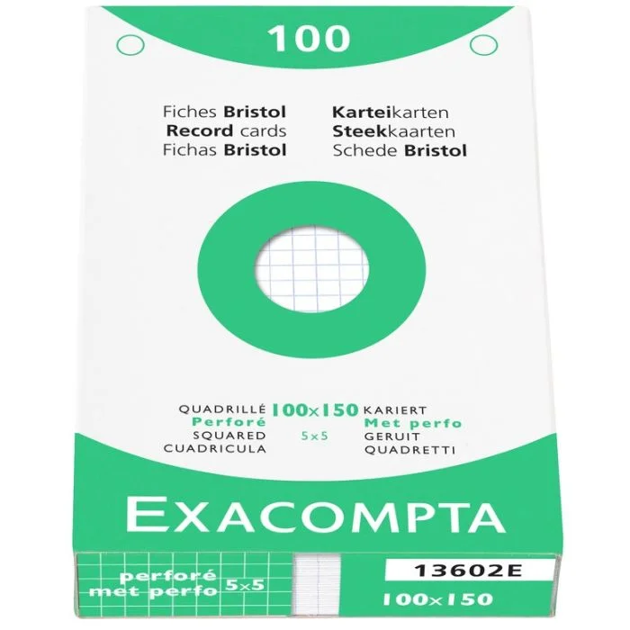 Lot de Fiches Bristol quadrillées et perforées - 100 x 150 mm - Blanches EXACOMPTA pour notes et mémos. N° article 13602E