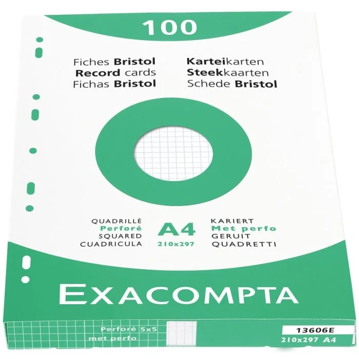 Fiches Bristol quadrillées et perforées - 210 x 297 mm - Blanc EXACOMPTA Lot de 100