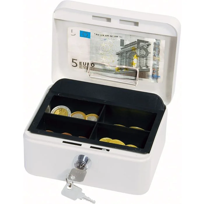 Caissette à monnaie portable blanche en acier 152 x 115 x 80 mm pour l'argent liquide WEDO. N° article 145 100H