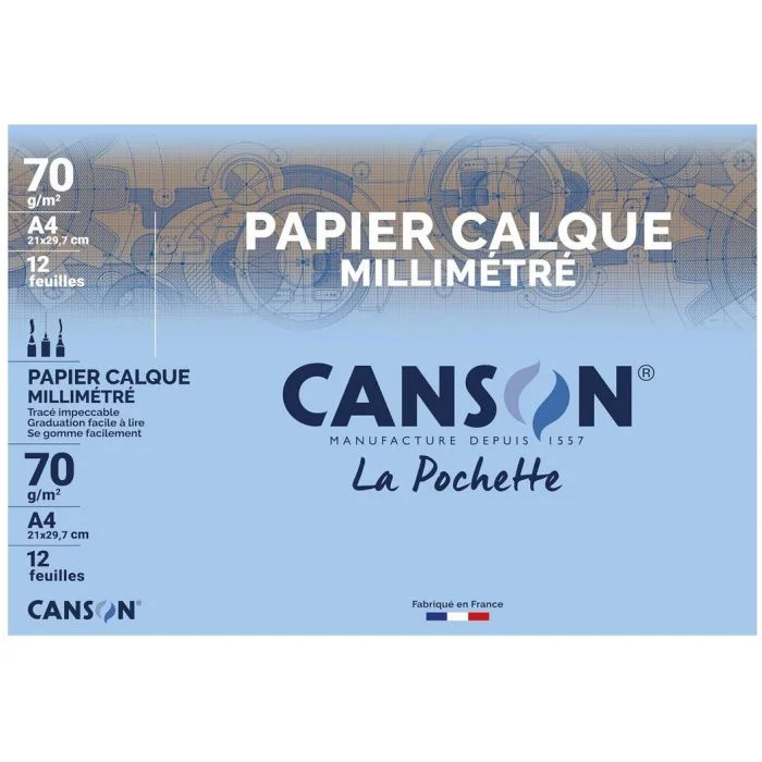 Feuilles de papier calque millimétré A4 CANSON pour dessin technique à l'école, en entreprise, au bureau ou pour les loisirs créatifs. N° article 200017155