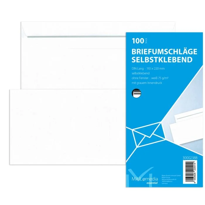 Enveloppes 110 x 220 mm à fermeture auto-adhésive sans fenêtre MAIL MEDIA pour le courrier. Paquet de 100. N° article 30002388