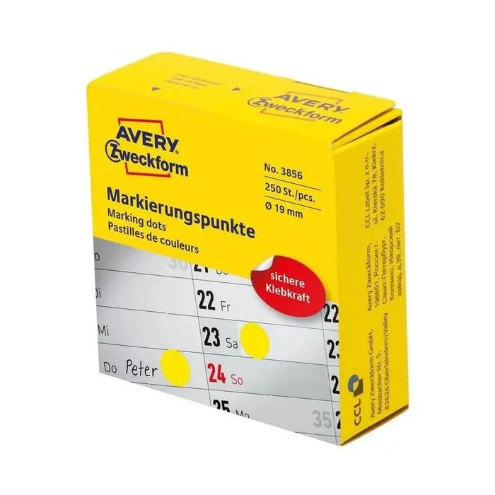 Boite distributrice d'étiquettes autocollantes rondes 19 mm jaunes d'Avery, gommette de marquage et de signalisation de produit. N° article 3856