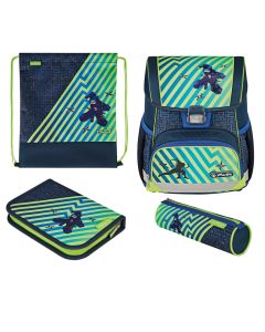 Inclus : Étui d'écolier avec crayons, trousse, écussons, boîte à goûter et sac de sport.