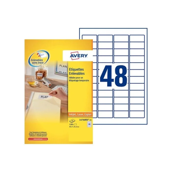 Planche d'étiquettes adhésives repositionnables 45,7 x 21,2 mm d'AVERY pour marquer, signaler et identifier les objets et produits. Grand Paquet. N° article L4736REV-25