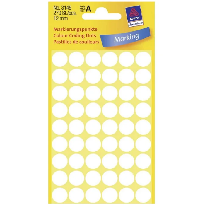 Etiquettes autocollantes rondes 12 mm d'Avery. Gommette Blanche de marquage et de signalisation de produit. N° article 3145