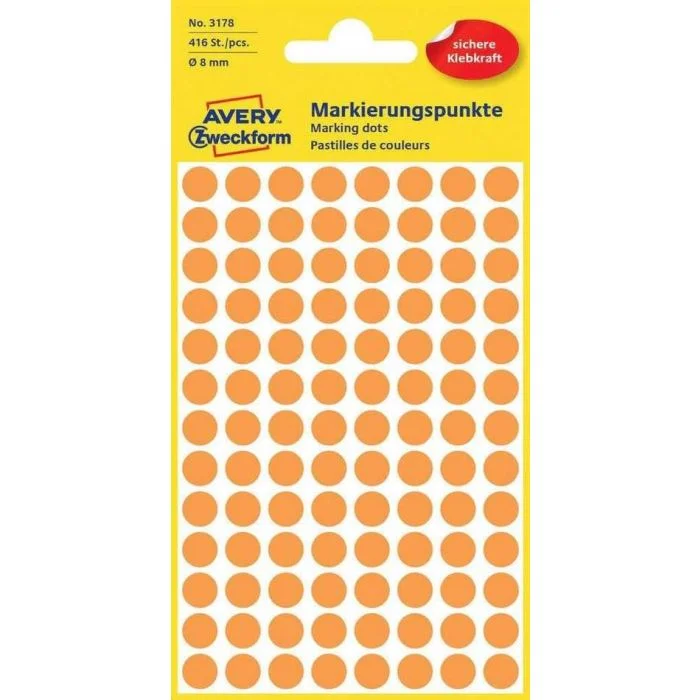 Petites étiquettes autocollantes rondes Orange fluo 8 mm d'Avery, gommette de marquage et de signalisation de produit. N° article 3178