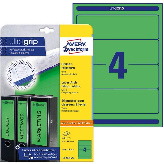 - 20 planches A4 par pochette, soit 80 étiquettes vertes.