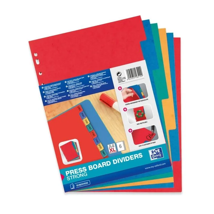 Assortiment de 6 intercalaires en carton 225 g/m2, format 245 x 297 mm d'OXFORD. N° article 100204990